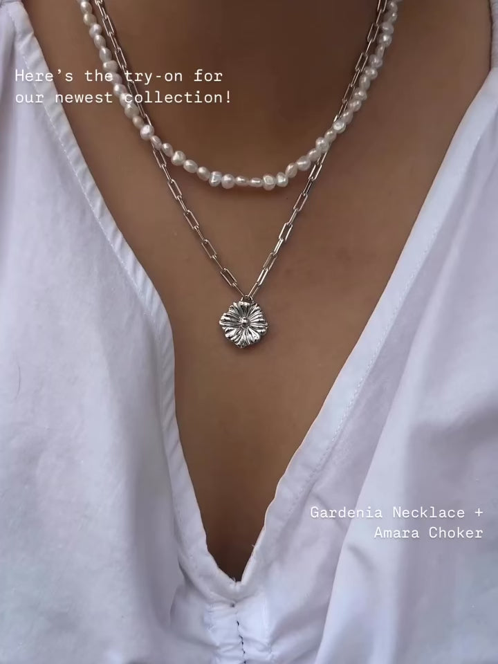 Our Gardenia Necklace comes with a bold flower motif on an iconic paperclip chain, perfect for stacking and layering. Its bold design stands out beautifully when styled with a simple, minimal top, or it can be paired effortlessly with any of our Summer Pearl pieces.