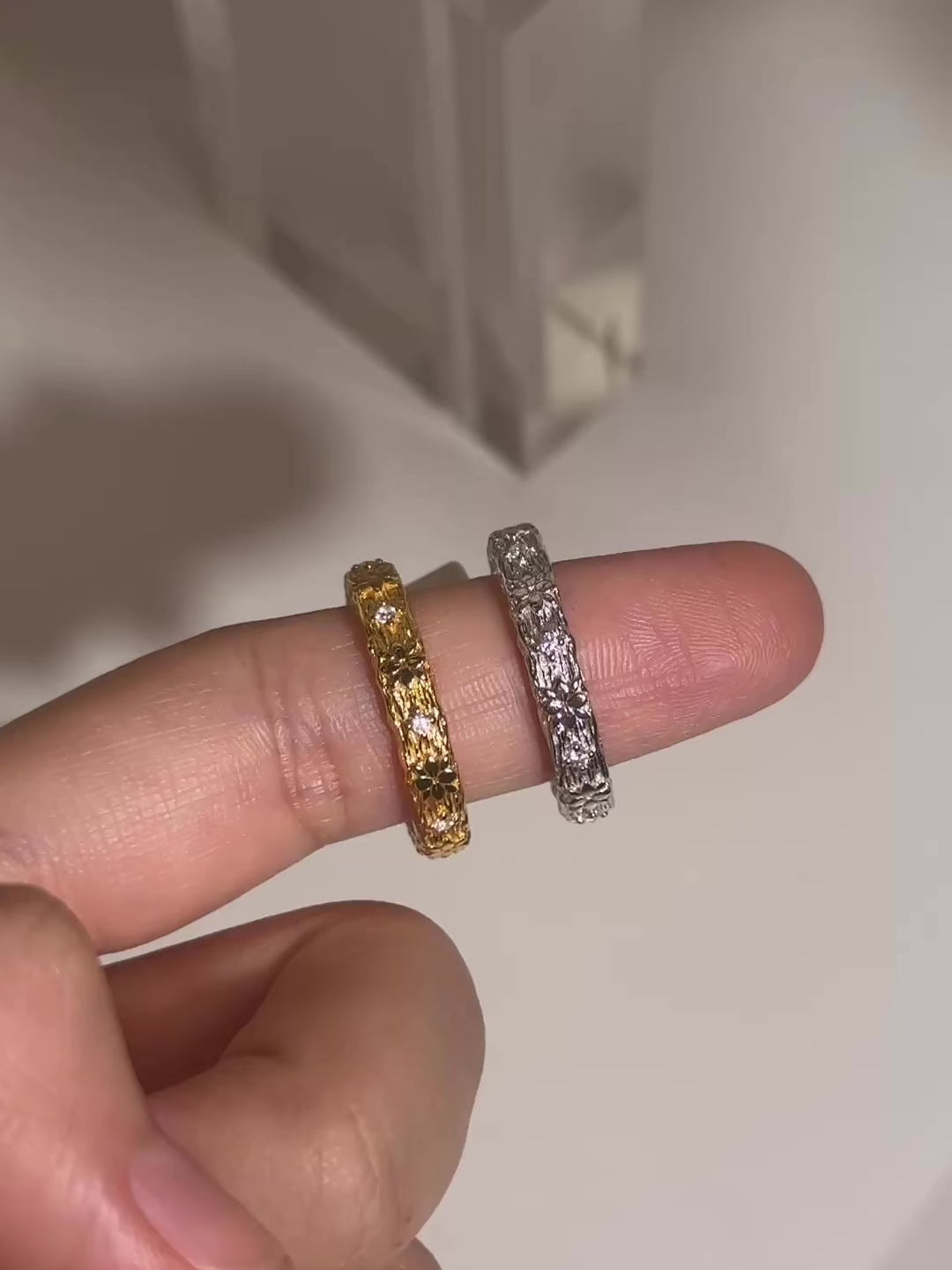 The Magnolia Ring showcases a vintage-inspired design with a row of intricate flowers and spaced gems elegantly wrapped around a brushed, textured band. Perfect for those who appreciate delicate details and a romantic touch, this ring adds a timeless, feminine charm to any collection.