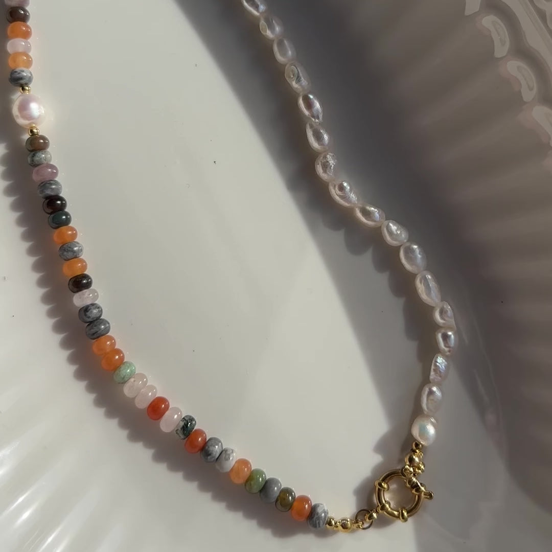 A balanced mix of natural stones—rose quartz, map jasper, green agate, and more, paired with freshwater pearls and a statement jumbo spring ring clasp.